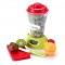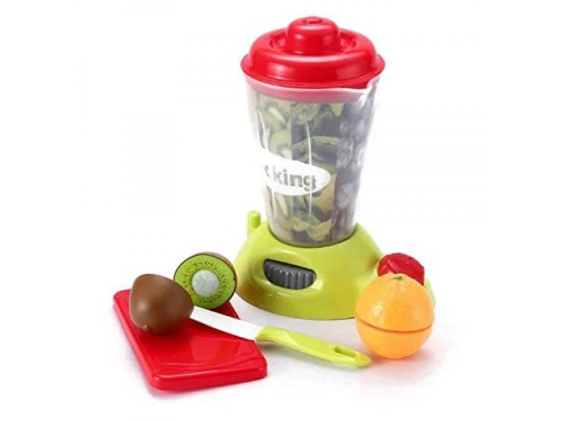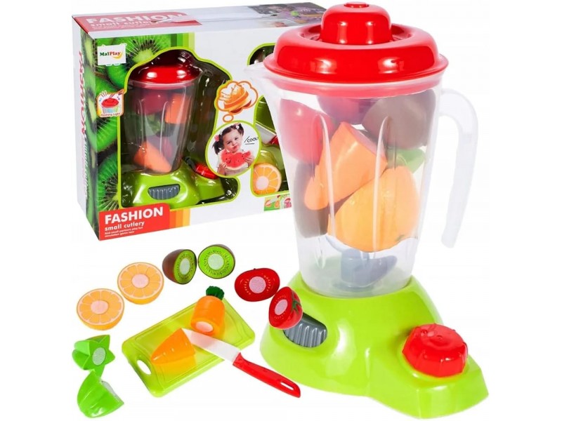 The toy includes a blender, a cutting board, a knife, and plastic fruits and vegetables.
